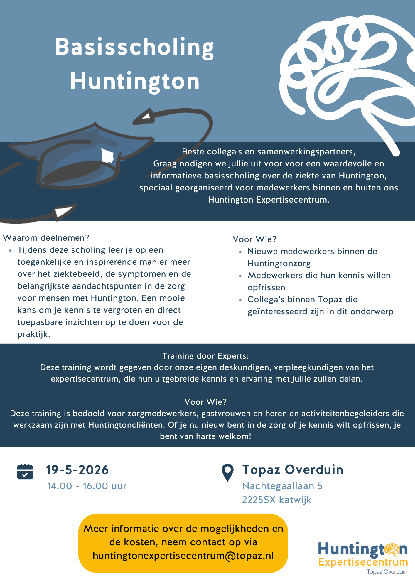 Op 19 mei 2026 is er weer een Basisscholing Huntington. Professionals zijn van harte uitgenodigd om tijdens deze scholing meer te leren over het ziektebeeld, de symptomen en de zorg.