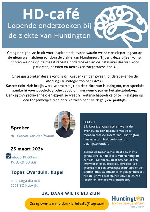 Op 25 maart 2026 is er weer een HD-café. Deze avond zal dr. Kasper van der Zwaan vertellen over de nieuwste inzichten uit onderzoek.
