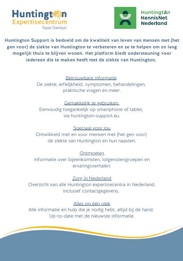 Stella van der Niet en Kim Geerlings hebben de implementatie van het platform opgepakt. Eind 2025 is Huntington Support overgedragen van Topaz naar Huntington Nederland, waar het in 2026 zal worden opgenomen in www.huntington-nederland.nl.